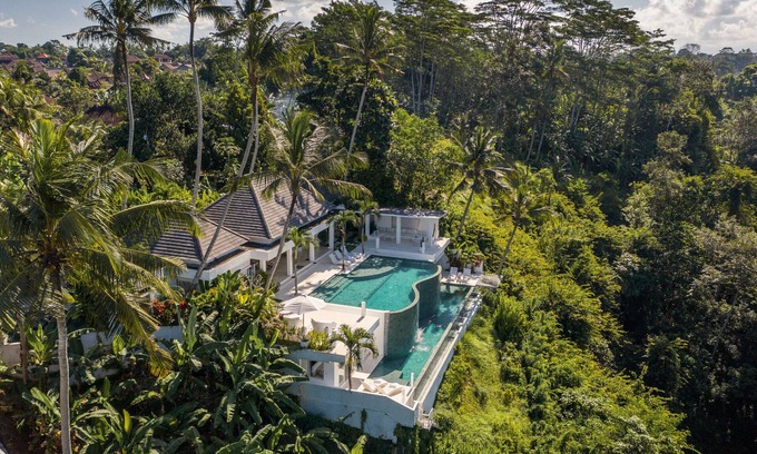 The villa features expansive living spaces and three stunning private infinity pools, each offering its own unique perspective on the vibrant jungle canopy. Whether lounging poolside or relaxing on the terraces, guests are immersed in the serene atmosphere of Bali.