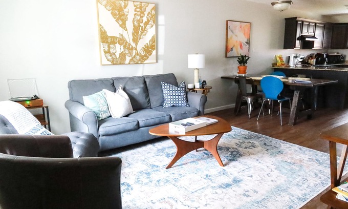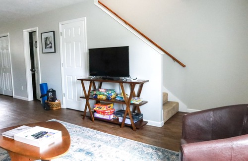 Open-concept floor plan. Living room has a sleeper sofa couch and we have additional bedding in the closet upstairs if someone needs it as a bed.
