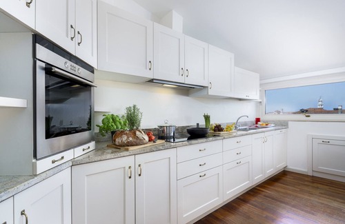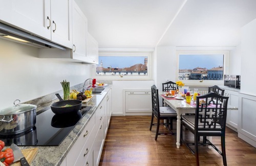 A fully-equipped kitchen/breakfast room with dapple-grey granite work surfaces, Grand Canal views and all the appliances one could possibly wish for, including a large fridge with icemaker, microwave and numerous coffee-makers to name just a few