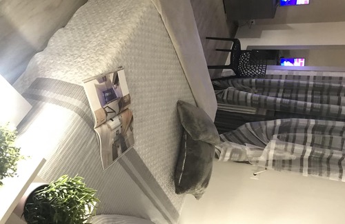 A sofa bed and air conditioning are featured at this 1-bedroom, 1-bathroom rental. Bathroom amenities include a hair dryer, a bidet, and towels. The kitchen is equipped with an oven, a stovetop, and a refrigerator, as well as a coffee maker, an electric kettle, and a microwave. Other amenities include bed sheets, an ironing board, and heating.