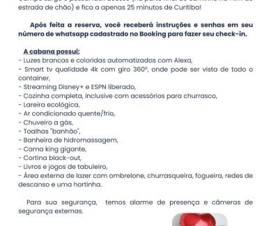 This Cabana Ninho do Quero-Quero in Campo Largo is well equipped and has all facilities that have been listed below. Please note that these details were shared to us by booking.com for the listed “Cabana Ninho do Quero-Quero”. We solely rely on their shared details and are regarded as “accurate”. If you have any concerns about the information or accuracy describing this Cabin, please let us know.