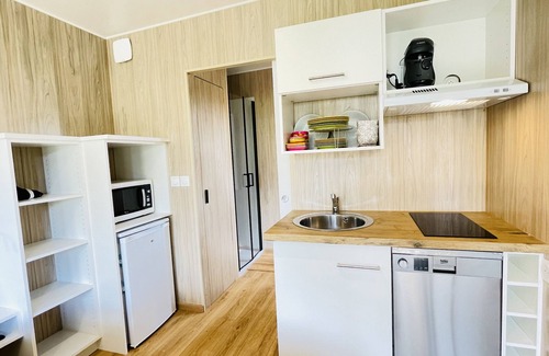It is set in a tastefully decorated garden with trees. The chalet has a beautiful kitchen with dishwasher, refrigerator, "Tassimo" coffee machine, microwave and cooking hobs. There is a double bed (140cm) with television, a dining area and a separate shower room with toilet. The independent terrace outside is ideal for enjoying the beautiful days. We have installed a small "Tefal" type grill for grilling in summer. Relaxation assured