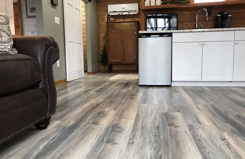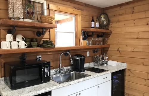 This is a one bedroom, one bath cabin. The master bedroom has an en-suite bathroom. In addition, there is a pull-out couch in the living room for an additional two guests. The kitchen is equipped with a mini fridge, wine cooler, electric counter-top burner, microwave and Kuerig coffee maker and is stocked with all basic eating and cooking utensils.