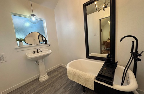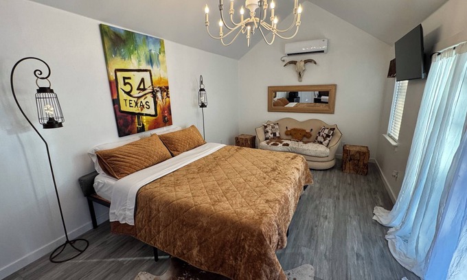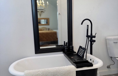 You’ll love this cozy King cabin. No smoking, no pets, no children. Just relaxing. One bed, one-bathroom western-themed cabin.Features high-quality bedding and a comfortable mini-split for both AC and heat.Perfect blend of romances and country charm with the clawfoot bathtub that has a shower handle for shower use.This is one of four cabins on our personal property. All are adults only for peaceful surroundings. There is a smart tv, WiFi, mini fridge, microwave and Keurig.There is about a 30 yard walk on a well maintained gravel path to this cabin. It sits on the back corner of our personal property right next to three other cabins that are also listed.Each one has a completely different style and theme. All are fitted with high-quality mattresses, bedding and decor.