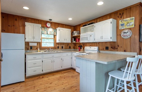 This updated “In-Law Suite” type cabin is the largest of the cabins located directly across from the main lodge. It has a full kitchen, full bathroom, has A/C and Heat with wheelchair accessible ramp.