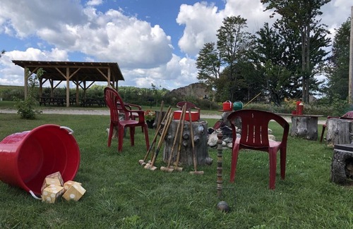 Outside: Large grassy areas in the back and center of the property, picnic area with tables and charcoal grills located at each cabin. Community Fire pit with log seating (firewood available onsite for small charge). In the warmer months, horseshoes, croquet and other vintage yard games are just steps away from your cabin.