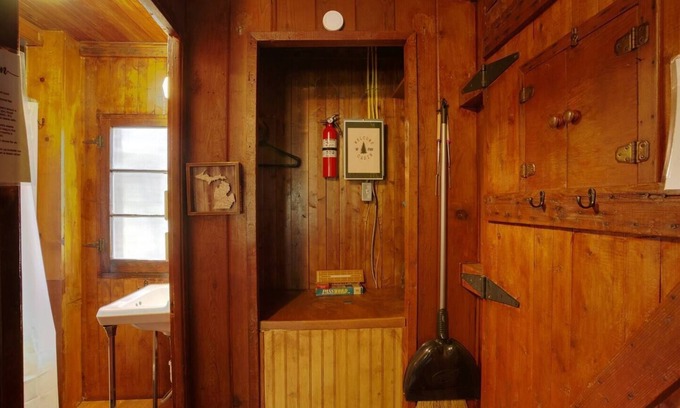 The "Snow Day", is a one room cabin that sleeps two on a full-size futon. The vintage table/desk is perfect for writing, playing a leisurely game of solitaire or relaxing with a cup of coffee while enjoying a view of the Cadillac countryside. The mini kitchen comes complete with a bar-size sink, microwave, counter high refrigerator, hot-pot and vintage electric percolator. Also included is Wi-fi, Roku Smart TV with Netflix, a vintage game or two, perhaps some reading material, a deck of cards and a cribbage board.