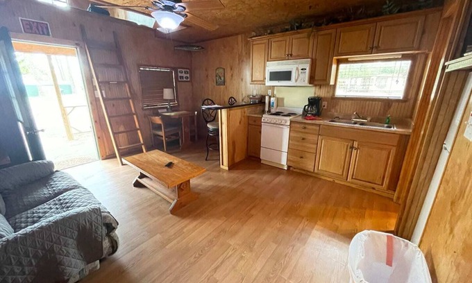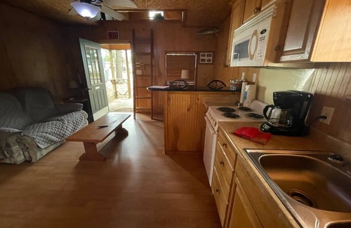 Cabin 14 at Tranquility Bay Resort includes: Kitchen, Queen bed in private bedroom, 1 Loft with full bed. Sleeps 4.