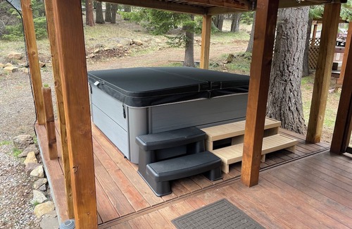 Relax with the whole family at this peaceful place to stay. One of our larger cabins, with a loft and an add on living room. This cabin boasts beautiful views and a close walk to the restaurant. Enjoy a private brand new oversized 5 person hot springs covered hot tub overlooking the scenic forest behind the cabin. Cook inside with a full kitchen, or barbecue on the covered deck with our propane grill. With great views of the surrounding wilderness be sure to view the pictures of this cabin to see how truly beautiful this place is.