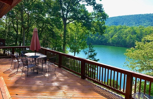 This two-bedroom, one bath cabin has a fully stocked kitchen and a charcoal grill for use on the full length deck.