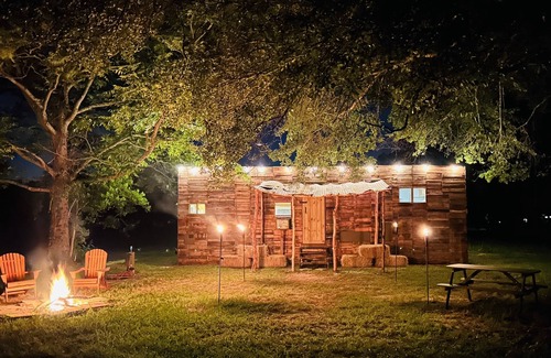 Farm fresh eggs in the morning. Spend the day fishing and swimming. The cabin is located on a 15 acre property with your own personal and private outside space, a fire pit for the evening and charcoal grill to cook your day’s catch. Great for families, friends and romantic getaways. Sleeps 4 comfortably with a kitchenette and bathroom. The bedroom has a queen size bed, the living area has a trundle bed with two twins. High speed internet and streaming services on the TV. The kitchen has a 2 burner cook top, microwave, mini fridge, all cooking utensils provided. Kurig coffee maker. There is a 3 minute walk over grassy pasture from the parking area to the cabin. Carts are provided to help carry your belongings. Fur babies are welcome!