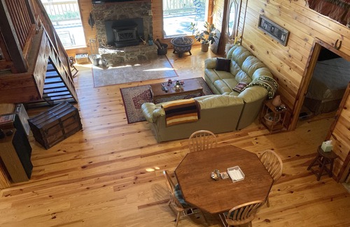 This cabin has 3 private bedrooms, 2 full baths, and fireplace-all with breathtaking views of the surrounding forest and Current River.
