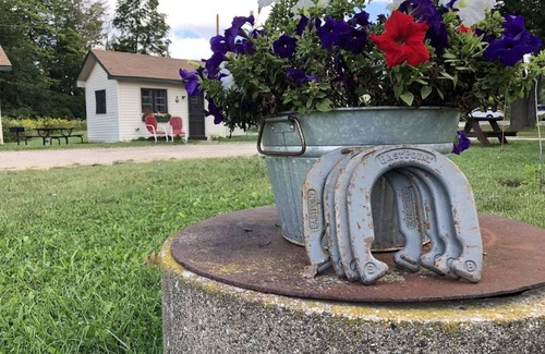 Outside: Large grassy areas in the back and center of the property, picnic area with tables and charcoal grills located at each cabin. Community Fire pit with log seating (firewood available onsite for small charge). In the warmer months, horseshoes, croquet and other vintage yard games are just steps away from your cabin.