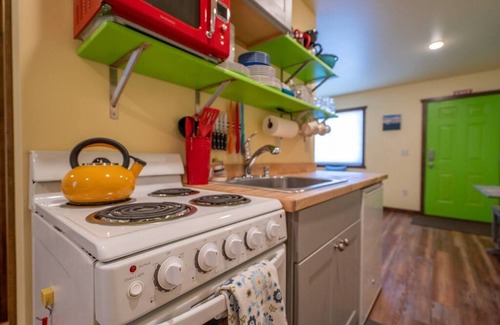 These simple & cozy, studio-style cabins, feature an open floor plan with 2 queen beds, a self-inflating AeroBed, full kitchen & bath, living room & dining area.