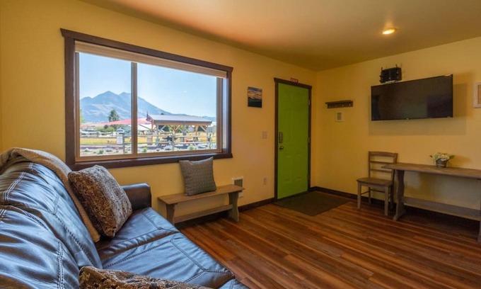 Each cabin has a mountain view of Emigrant Peak with a private porch & 2 Adirondack chairs.