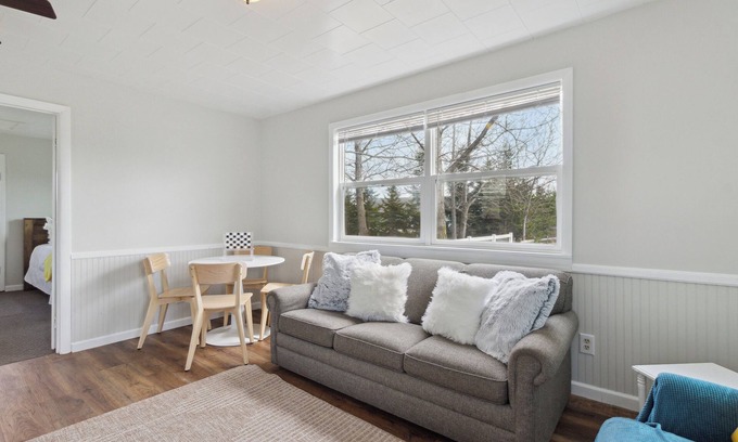 Cabin 7 is a charming two-bedroom retreat featuring a king bed in one room and a double bed in the second, comfortably sleeping up to 4 guests. The combined kitchen and living area includes a kitchenette and dining table for four. Enjoy a private bath with shower, two new flat-screen TVs with cable, high-speed internet, and air-conditioning. A perfect spot to relax and enjoy your Arcadia, Michigan getaway in comfort and style.
