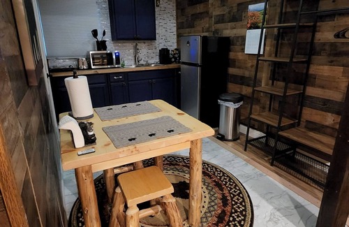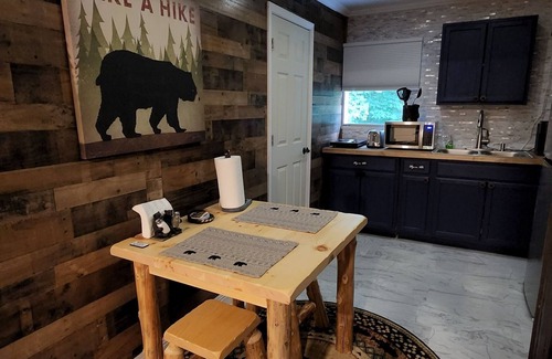Smoky Bear Lodge is a 4-plex boutique lodge across from the Smokies National Park! Each room is private with no shared living spaces. We are located on US-321, which leads directly into downtown Gatlinburg (20 min). The Maddron Bald National Park trail is 1 minute away . Dogs MUST BE on the reservation when booking. Dollywood is 35-40 mins away. There is an outdoor shared community area with Charcoal Grill, Picnic Table, Water Fall Feature, Fire Pit, and Large Game Room (In detached building)!! This unit is approximately 315 sq ft, with a luxurious Stearns & Foster king size mattress. All furniture is custom made from wood. Enjoy the 75" smart HDTV which is connected to xfinity cable and has the ability to connect to any of your streaming services. There is also a desk you may use.