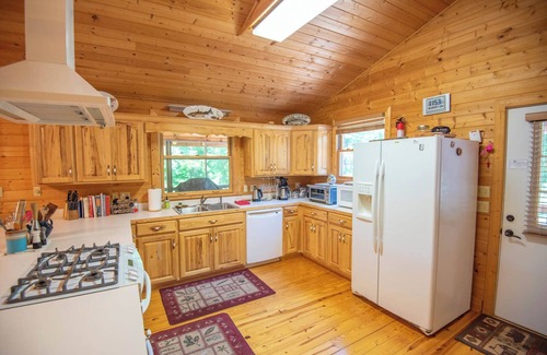 The inviting great room includes a cozy gas fireplace and a large TV, with satellite connections and free Internet wi-fi. The large kitchen comes complete with a dishwasher, toaster, microwave, coffee maker and all the dining accessories you'll want for peaceful home-cooked meals. The dining room seats four, with room for six more at the island bar. Of course, there's more dining available on the covered porch – as well as a bed for falling asleep to the gurgle of the stream passing beneath you. The cabin décor is rustic and very comfortable, with charming wood paneling, cathedral ceilings and a double vanity in one of the bathrooms.