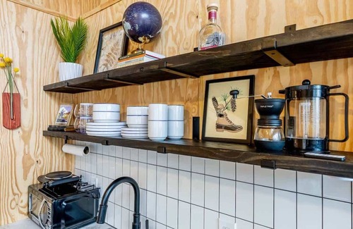 This tiny cabin has an open floor plan with lots of windows to let in the natural light and wooded views. Guests can enjoy the comfortable queen size bed downstairs with plenty of built in storage for clothes and bags.