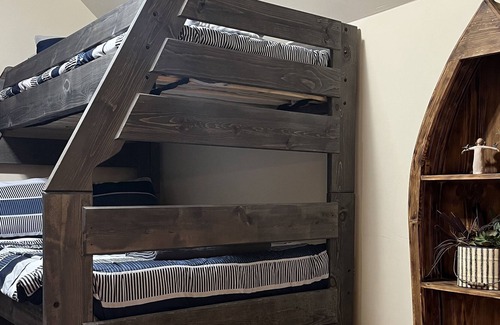 Our cabin at Lake Scott State Park is located on the East side of the lake in a tranquil setting right across from the water. It can accommodate up to eight people, has a full kitchen, bath with shower, sleeping loft, and a large deck. Cabin includes a loft sleeping area with two twin over full bunk beds. The large sectional couch also pulls out to a full size bed.