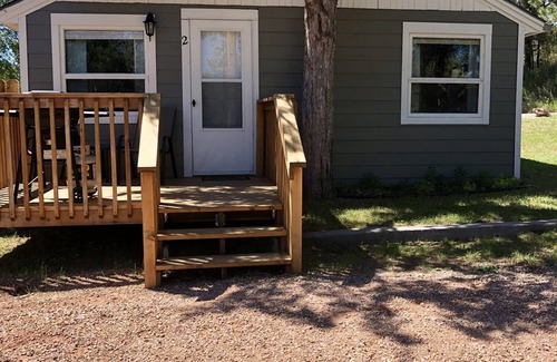 Our Buffalo cabin is designed in honor of our local buffalo friends residing at Wind Cave National Park and Custer State Park. This is a 486 square foot cabin with one bedroom with a queen sized bed, a living area with a full size futon for extra guests, kitchen table, and full kitchen and bathroom. This cabin has a nice porch area with beautiful views of the lake. There are two chairs, a small table, and grill on the porch. There are games and books to help you relax after a busy day exploring. There is no cable, and no TV but we do get great cell coverage. Maximum 4 guests.