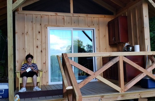 12 x 12 cozy cabin with loft, small outdoor kithchen and compost toilet. Queen bed and two twins on loft. Perfect for ages 7 and up. Sleep4. Amazing views....