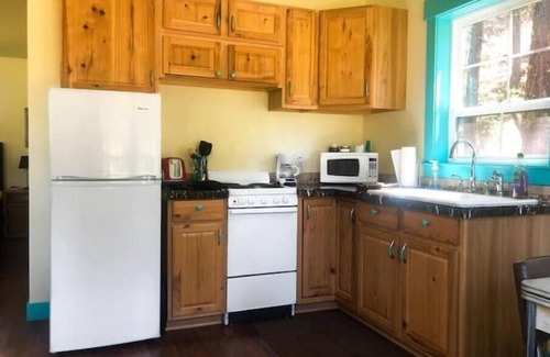 A comfy and modern cabin space with a full kitchen, well water from the sink(delicious) closet, wood stove living space and King size bed. A 180 feet walk down a fairly steep-hill to your own private space makes you feel at home. During winter you may want winter boots. Only a 5 mile drive to Leavenworth. Twenty minute drive to Wenatchee. Our home is on the property.