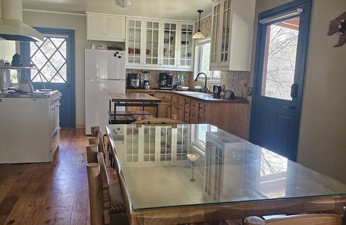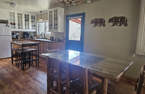Beautiful Cabin, recently decorated, four bedrooms 2 bathrooms. master bedroom has a king size bed and a metal futon frame with full size bed mattress, downster 3 bedrooms. Room one has king size bed, Room two queen size bed, Room 3 kids bed twin/full. Two smart tvs. dvd player, movies , wifi, Free Netflix and Amazon prime videos.