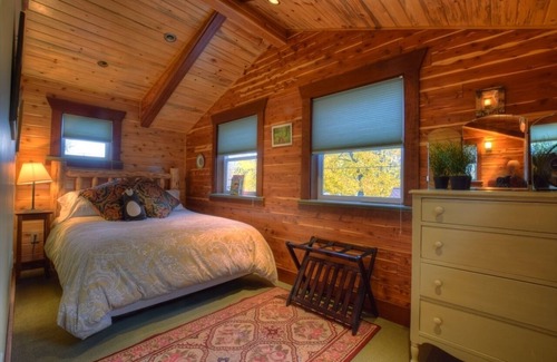 Completely renovated, the cabin features a full kitchen, living room, and bedroom. There is a queen-sized bed in the bedroom as well as a couch in the living room. This is a cozy property reminiscent of a small cabin in the woods, and the cedar paneling and warm atmosphere reflect that. Heat is provided by an electronic, automated gas stove, conveniently keeping the cabin toasty warm while imparting the ambiance of an old-fashioned wood stove. Air conditioning is also provided in the summer.
