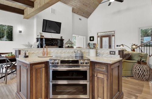 Cooking here is a treat, since the kitchen is fully stocked and features a copper farmhouse sink, flex duo oven, and smart refrigerator. Take the entertainment outside as you fire up the new griddle on the deck for pancakes with a view and dine al fresco at the outdoor table.