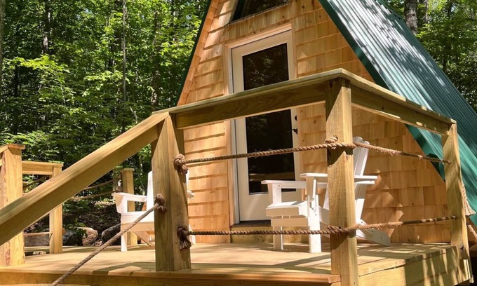 Cabin located at In The Trees Maine Treehouse Rentals & Mountain Disc Golf in Stoneham, Maine. A real and rustic Maine woods experience! This is a primitive style cabin similar to camping. It lies 400 feet up the mountain nestled in the disc golf course. Sleeps 2, 2 twin size beds, bedding included, 12v solar powered electric with usb, no running water, private outhouse right outside the cabin, private fire pit and deck, small table and chairs, grill, free disc golf and a mountain hike to the summit where you can scale a 5-story lookout tower with incredible views of the White Mountains! This is a hikers dream! To access the cabin, you have to park in the parking lot then hike approximately 400ft. UP THE MOUNTAIN. We have an ATV so we can transport your belongings to the cabin if needed.