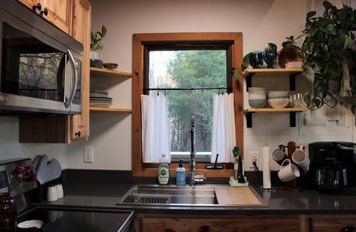 The kitchen has a full size fridge, a microwave, oven and stove. Plates, cups, utensils and most basic cooking supplies are available for use. Coffee maker and coffee bar will have enough coffee and supplies provided to at least get you through your first morning. There is not a dishwasher but all supplies for hand washing dishes are provided, the dish drying rack is located under the sink. Additional information based in frequently asked questions. There is NOT a hot tub on this property. There is not central AC, there is a small AC unit in the loft bedroom and in the lower bedroom. The heating sorces are baseboard heaters controlled by thermostat and a pellet stove in the loving room. This cabin is pet friendly and there is a pet fee of $35. Maximum amount of pets is 2.