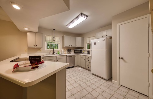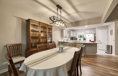 We have a furnished living room, dining room, and 3 bedrooms (1 king upstairs, 2 queens on the main floor). We also have a pull-out queen sofa in the living room. Upstairs is the en-suite full bath with a soaking tub and an additional shower. A full bathroom with a tub/shower combo is on the main level.