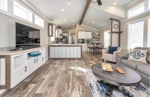 This stylish cabin features a spacious living area complete with a queen sleeper sofa, a fully equipped kitchen, and a separate dining area perfect for hosting guests. The primary bedroom boasts a luxurious queen bed and an en-suite bath, while the second bedroom is furnished with a twin bed and is conveniently located next to the second bathroom. Additionally, you'll find modern conveniences such as a clothes washer/dryer, high-speed Wi-Fi, and a Bluetooth speaker system for your wedding playlist. Step outside onto the outdoor patios and soak in the tranquil surroundings, or take advantage of the private community lake stocked with native fish—ideal for relaxation after your celebration.
