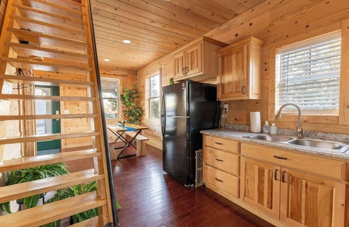 Inside, each level offers its own special experience. The first floor features a private bedroom with a king bed and an attached full bathroom for added comfort. Head up the ship-style ladder to the second floor, where you’ll find a bedroom with a twin bunk bed and another full bathroom. The third floor is a cozy loft with two queen beds, perfect for kids or extra guests. The dining area includes a table and chairs, great for family meals or late-night card games, and the cabin offers both a well-equipped indoor kitchen and a covered outdoor kitchen for al fresco cooking.