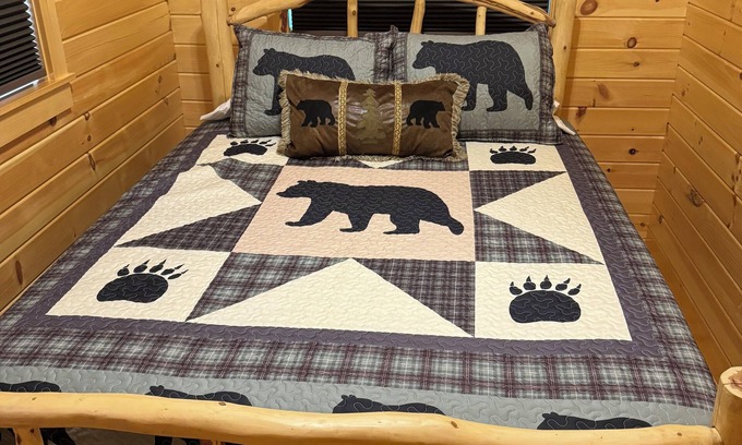 The highlight of your stay will undoubtedly be the bedroom, aptly named the “Canopy Suite” Here, you'll find yourself surrounded by the calming whispers of the forest, as you drift off to sleep in a comfortable handmade log queen bed with a view of the crystal clear spring creek just outside your window. The Treetop Bunks are a handcrafted log twin over full great for kiddos. The bottom bunk will accommodate 2 adults comfortably.