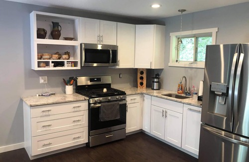 This little cabin is a great place to getaway to. Formally a pottery studio for local well known artisan Bob Brotherton this property has been transformed into an outdoor lovers retreat. It is not uncommon to hear a pair of eastern screech owls, have a visit from a flock of wild turkeys or even a visit from a black bear. The large deck across the front of the house is a great place to relax and enjoy your morning coffee or an evening dinner with a sunset across the Appalachian mountains.