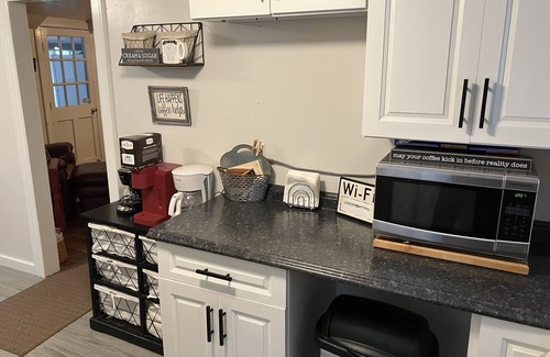 Has an updated full bathroom w/ large walk-in shower, full kitchen w/ SS appliances, microwave, coffee bar, outdoor grill w/ propane, large enclosed porch w/ seating for 6 and 2nd refrigerator/freezer. There is an updated rustic fire pit area w/ seating for 8 provided (Firewood NOT provided!) 43” smart tv, high speed internet and cable through Xfinity, DVD player w select DVDs, and landline phone.