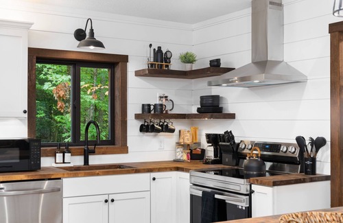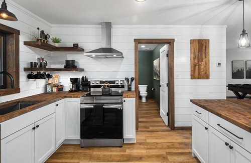 Ideal for family gatherings! Enjoy preparing meals in the kitchen featuring an electric stove top and range hood. The kitchen also boasts butcher block countertops. Additionally, there's a relaxed dining room area with seating for 8.