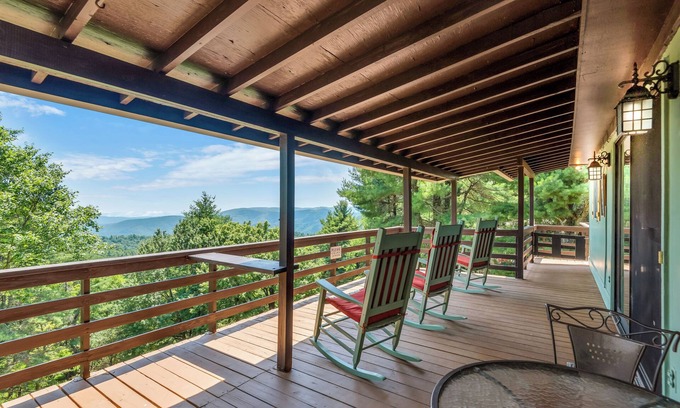 Enjoy the enchanting view of 4 mountain ranges from the two porches around the house. The view from the rocking chairs on the deck is fabulous.