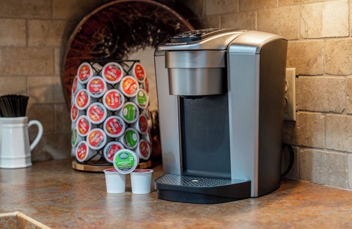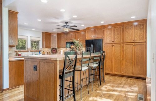 The kitchen includes seating for 6, and has an electric range, oven, and microwave. It is fully stocked with cookware, dishware, can opener, coffee maker, toaster, and blender. There is plenty of cabinet space for food and storage. We provide napkins, cooking oil, salt and pepper for seasoning, and creamer/sweeteners for your morning coffee.