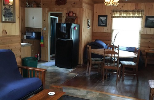 The property is surrounded by forests and trails to hike and bike. The cabin can sleep 5 and has an open concept kitchen with living and dining areas. We now have air conditioning! There is 1 bedroom with a queen bed. The living areas have1 full bed and 1 twin bed and 1 bathroom. There is parking and room for a boat and trailer. Private deck and fire pit are right next to the cabin. The Enchanted Loon B&B is next door and has a bar that seats 11 overlooking the lake. There are two large decks, swim and fishing piers shared by cabin and lodge guests. Moccasin lake is a Class A fishing lake with musky, walleye, bass and panfish of all species. Excellent for swimming and recreation. We have no public landing to place your boat, kayaks, or canoes on but there are hundreds of lakes close by. Our lake is a clear and healthy lake with no invasive species. We are concerned about invasive species getting into our lake and not allowing used rafts and floats (new out of the box is great) will help prevent their transfer. In addition, we have a fleet of aluminum boats with motors to rent for $60.00/day.