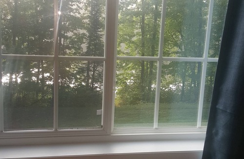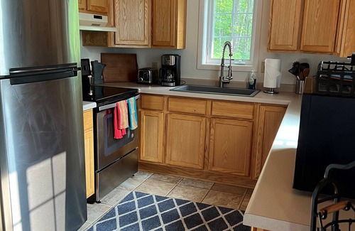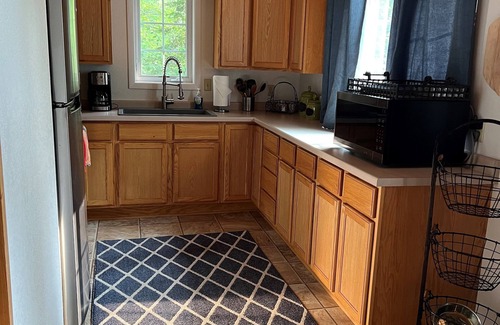 New furniture, new modern appliances, vaulted ceilings, one bedroom, sleeper couch, fully stocked kitchen utensils, grill, deck, gorgeous view of lake, hiking trail around the 26 acre property.
