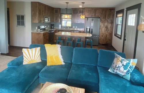 The comfortable home has three bedrooms, each with a queen sized bed. The downstairs living room has a large couch with a pullout bed and extra blankets and pillows.