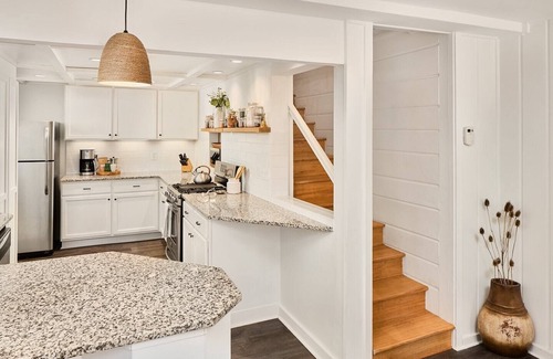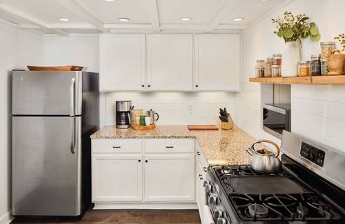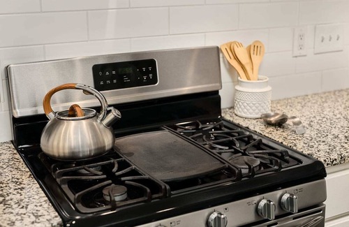 + On the lower of the 3 stories, you'll find the kitchen/dining room which is fully stocked with everything you need to cook and serve a beautiful meal. Stainless steel appliances, a gas stove, granite countertops and a fully-functional wood burning stove for heat and plenty of coat hooks to dry off those winter clothes after your adventures outside. Feel free to use any available spices and oils. We provide several coffee options, including a Keurig (upstairs in the sunroom), a french press, a grinder and a traditional coffee maker.