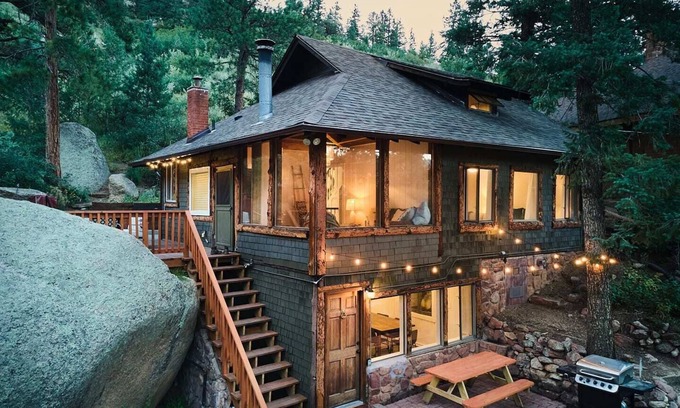 Gorgeous in every season, this 2 bedroom, 2 bath historic cabin backs to wilderness and has amazing views of the surrounding mountain peaks. Located on the base of Pikes Peak, Hidden Falls Cabin is just 10 minutes from Colorado Springs but it feels like a world away. Take in the views of surrounding forest and rock formations from your morning soak in the hot tub or under the outdoor shower. The cabin is an ideal destination for a restful retreat, a romantic getaway, and adventure hub.
