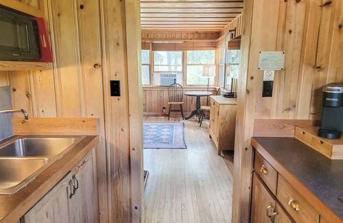 Step inside to discover a cozy studio-style bedroom and living space, complete with a king bed and a classic stone-built gas fireplace. The front door opens into the galley kitchen which has a two-element electric cooktop, under counter refrigerator, microwave, sink, coffee maker, and useful kitchen utensils and equipment. There is a compact bathroom with a shower.