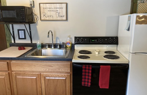 Pine Cabin has all the features for a Northwoods getaway! Our cabin offers a king size bed along with a twin bed and sofa sleeper. Bathroom has stand up shower, toilet, sink and towels provided. The kitchen has refrigerator, electric stove, microwave, toaster, drip coffee maker, pots/pans, plates, silverware, and glassware. Outside, guests have use of a dock slip, kayaks, rowboat, pedal boats, charcoal grill, and firewood for summer fires. Pine Cabin is one of four cottages on the property. Located on HWY 70 on the edge of the Eagle River city limits. (Exterior camera at driveway entrance to see if plow driver clears the snow in the winter season)
