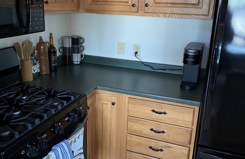 Kitchen: New gas stove, all new cooking pans, cast iron pans, seasonings, K-cup machine