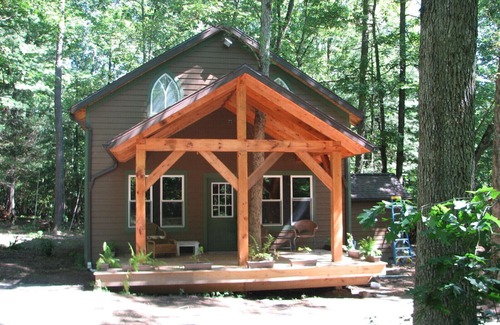 A unique, large, post and beam covered porch expands in door living spaces to the outdoors. Warm summer days with cool summer breezes will likely cause migration to the Porch. As evening turns to dark our quests most often move to the fire pit. Sparking crackling campfires are a nightly occasion when weather permits. Fire roasted hotdogs or steaks are usually followed by smores or campfire fruit pies. After all of this you shouldn't have any problems sleeping.